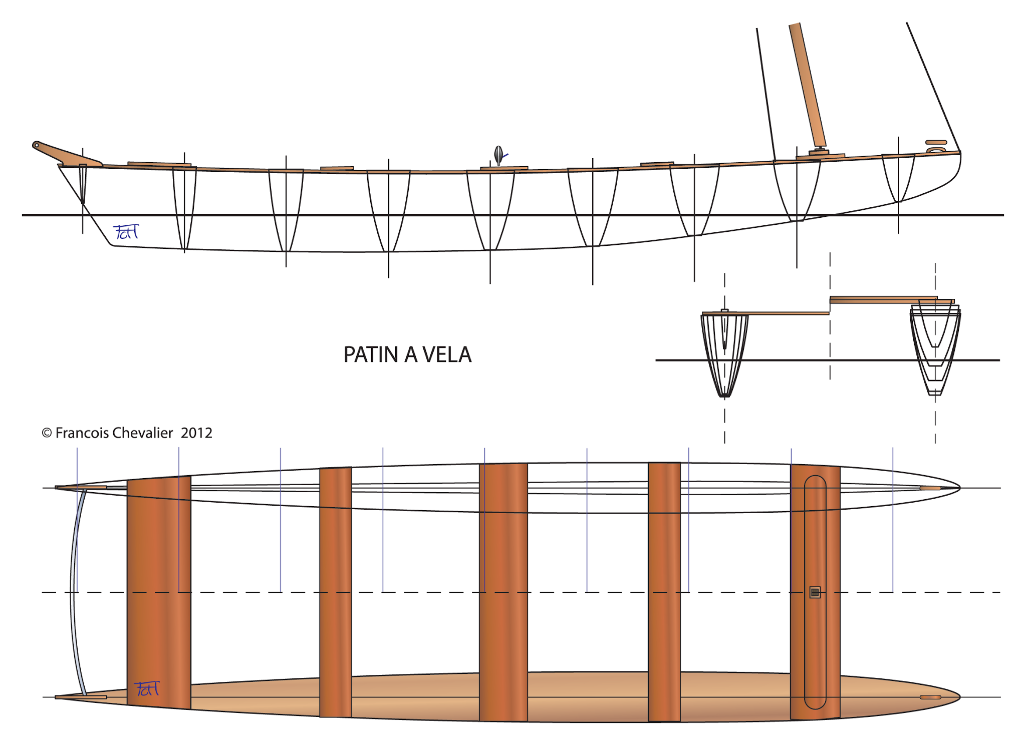The Skate 14 is an old project that I had kept in the drawer. The Patin a vela had appealed to me when I was studying architecture at the Beaux Arts de Paris. I imagined my own take of the same concept, with shorter length and more elaborate asymmetric lines, but keeping in scope with the original, with minimal deck fittings, the boat would also ne easy and fast to step the rig and set sail. The idea was to create sufficient volume when heeling to compensate for the shortened hull, while maintaining lateral lift on the after sections.
