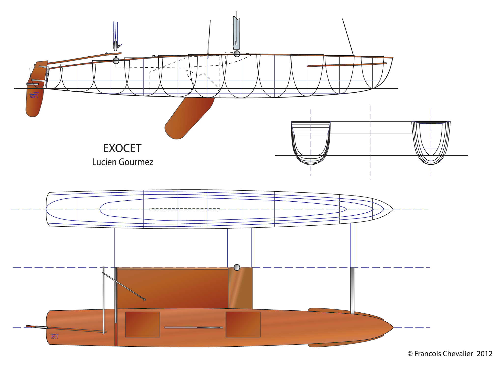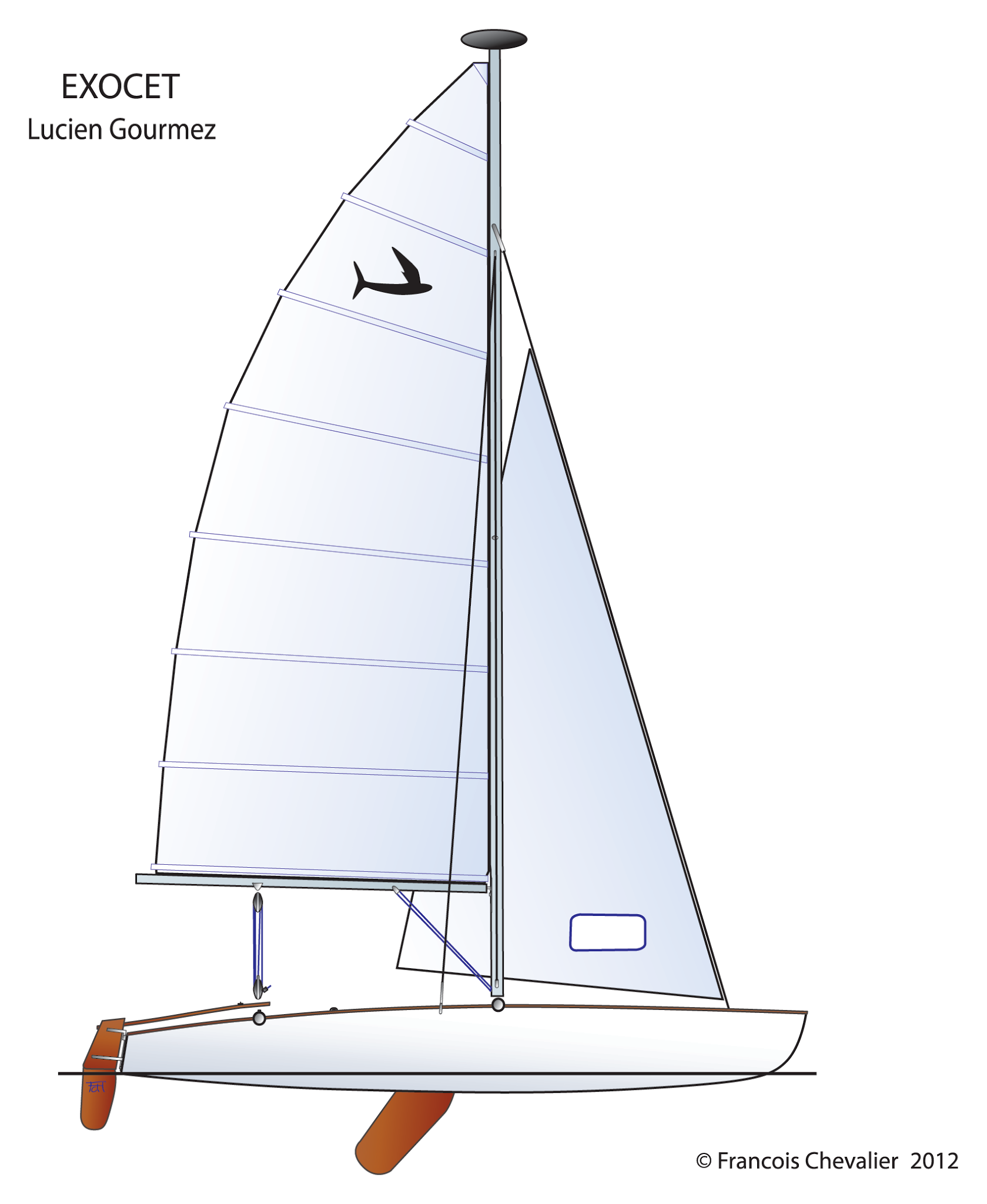 In France, Lucien Gomez is known as the godfather of sport multihulls. In 1957 he designed and built the Exocet, a larger and loftier catamaran than the Shearwater. Her lines were more full-bodied, she also featured deflectors on each bow that reduced spray and pitch-poling. A lenticular floater on the masthead prevented the Exocet from turning turtle during capsizes.