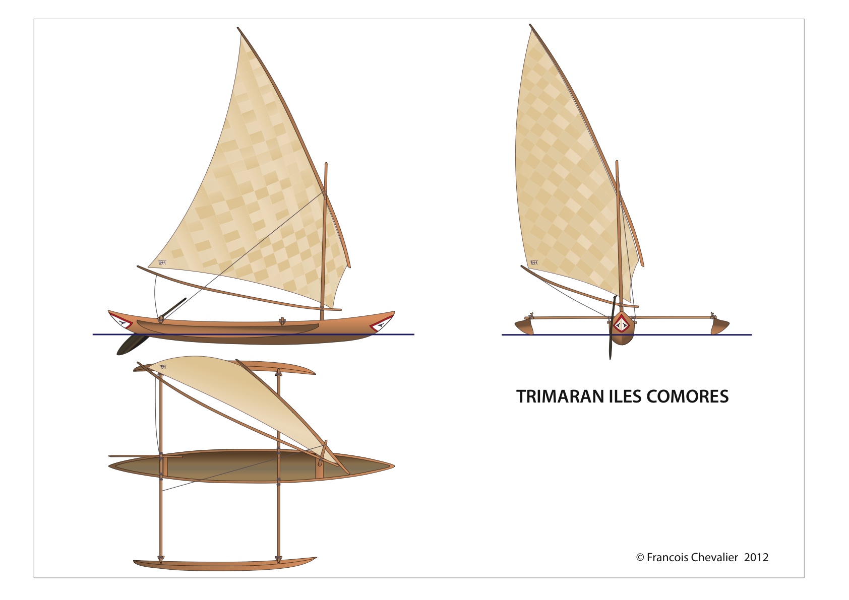 This particular trimaran was drawn in Zanzibar in the early 20th century, and a few of her kind are still afloat to this day. If the loose-footed sail is an Arab trait, the actual design of the craft is of Indonesian influence. The bottom of the two outriggers on either side were flat and faced outwards, similarly to waterskis or hydrofoils. The sail was set on a short mast, in the centreline of the craft, and changed tacks on every beating leg. Measuring 7 to 9 metres in length, these machines could sail at similar speeds to modern multihulls.