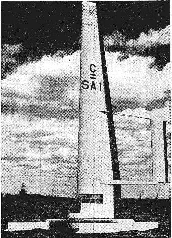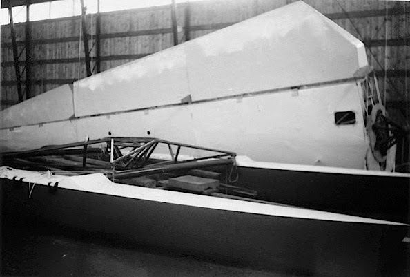 The wing consisted of 44 frames, each spaced 8in from one another. The base was a turning circle, set in a rollerbearing between the forward crossbeam and the aft crossbeam. This complete structure is unstayed and pivots freely, enabling the sail to be hoisted and dowsed conveniently.