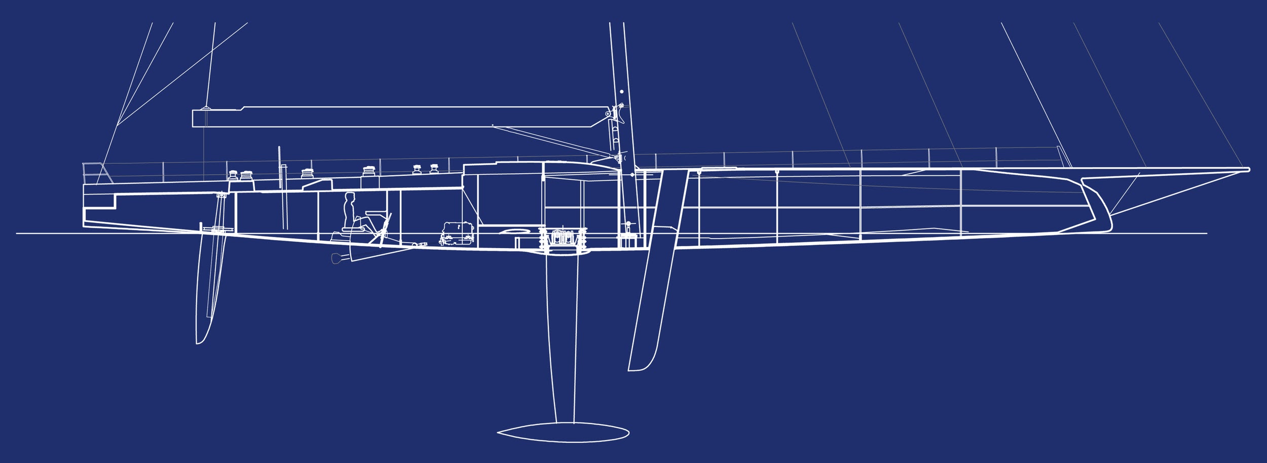 The wingsail had a particularly high aspect ratio, and turned 360° on a hard wooden base disk. There was no trapeze, no stays, and the helmsman remained enclosed in his plexiglass cockpit at all times. The aftercanard and its flap were controlled from the cockpit, and determined the incidence of the wing and its flap. The rudders were pedal-controlled. The pilot, whilst in the cockpit generated no air drag, but could not get out, and thus could not hike. There was a single centerboard located beneath the wingsail which swung laterally into place! The hulls hulls had very low freeboard, the bows were equipped with bulbs, similarly to large displacement vessels. The protrusion extended almost to the crossbeam. The rudders could retract into slots in the double-ender sterns.