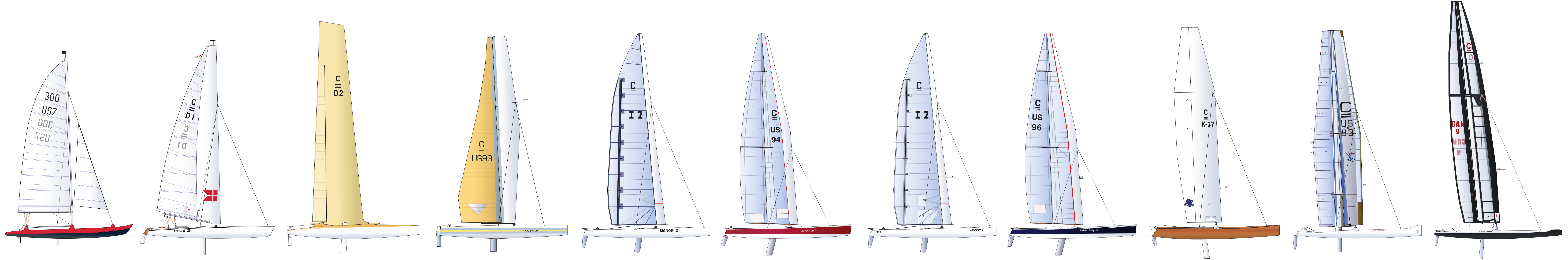 sail plans of Beverly (1962), Opus III (1969), Dulcinea (1970), Coyote V (1980), Signor G. (1980), Patient Lady V (1982 config), Signor G. (1982), Patient Lady VI (1985), The Hinge (1987), Freedom's Wing (1991) and Canaan (2010) - drafts courtesy © François Chevalier