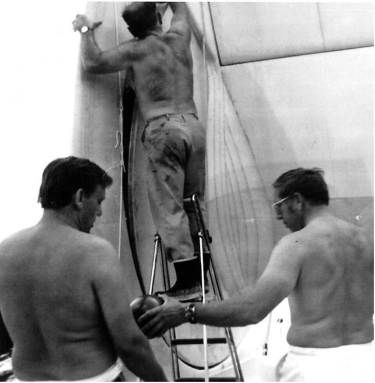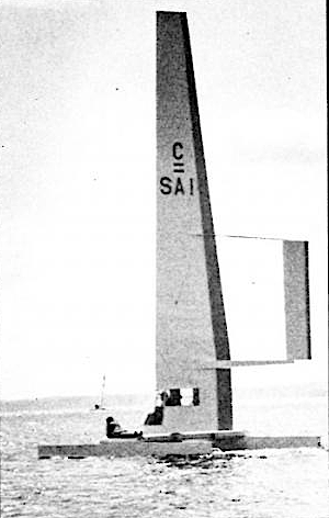 Courtland Butler Converse (1932-1968). Court was the youngest commodore in the history of the Beverly Yacht Club in Marion, MA. He came from the family that gave its name to the company renowned for its world famous All Star basketball shoes. He was married to Josephine Saltonstall, whose brother William G. Saltonstall, Jr. had steered Beverly in the Little America's Cup in 1962. |  The wing designed by Court Converse in 1968 foreshadows that of Australian Roy Martin's Miss Nylex, winner of the Little America's Cup 1974. The sail was put away in a hangar with the hulls of Beverly II for sixteen years, before being demolished. (unknown photographer, Steve H. Clark collection) |